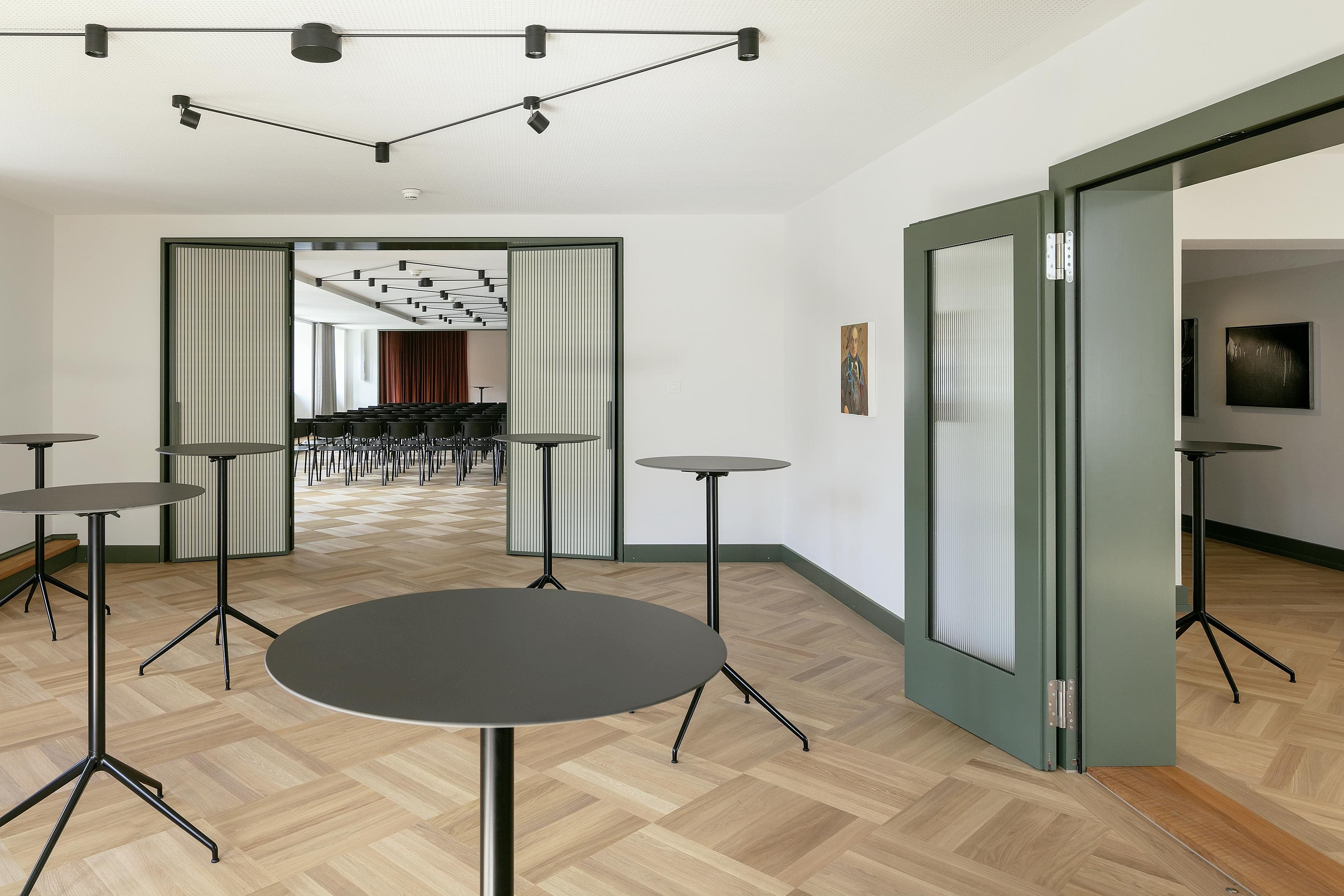 Entdecken Sie unseren Kleinen Saal / Apéro Raum Nr. 206 als vielseitigen Veranstaltungsort, der sich ideal für Apéros und Stehlunches eignet. Mit einer kompakten Fläche von 34 m² bietet dieser Raum den perfekten Rahmen für Ihre geschäftlichen oder privaten Zusammenkünfte. Die moderne Ausstattung mit Stehtischen und WLAN sorgt dafür, dass Ihre Gäste sich stets wohlfühlen und vernetzt bleiben können.
