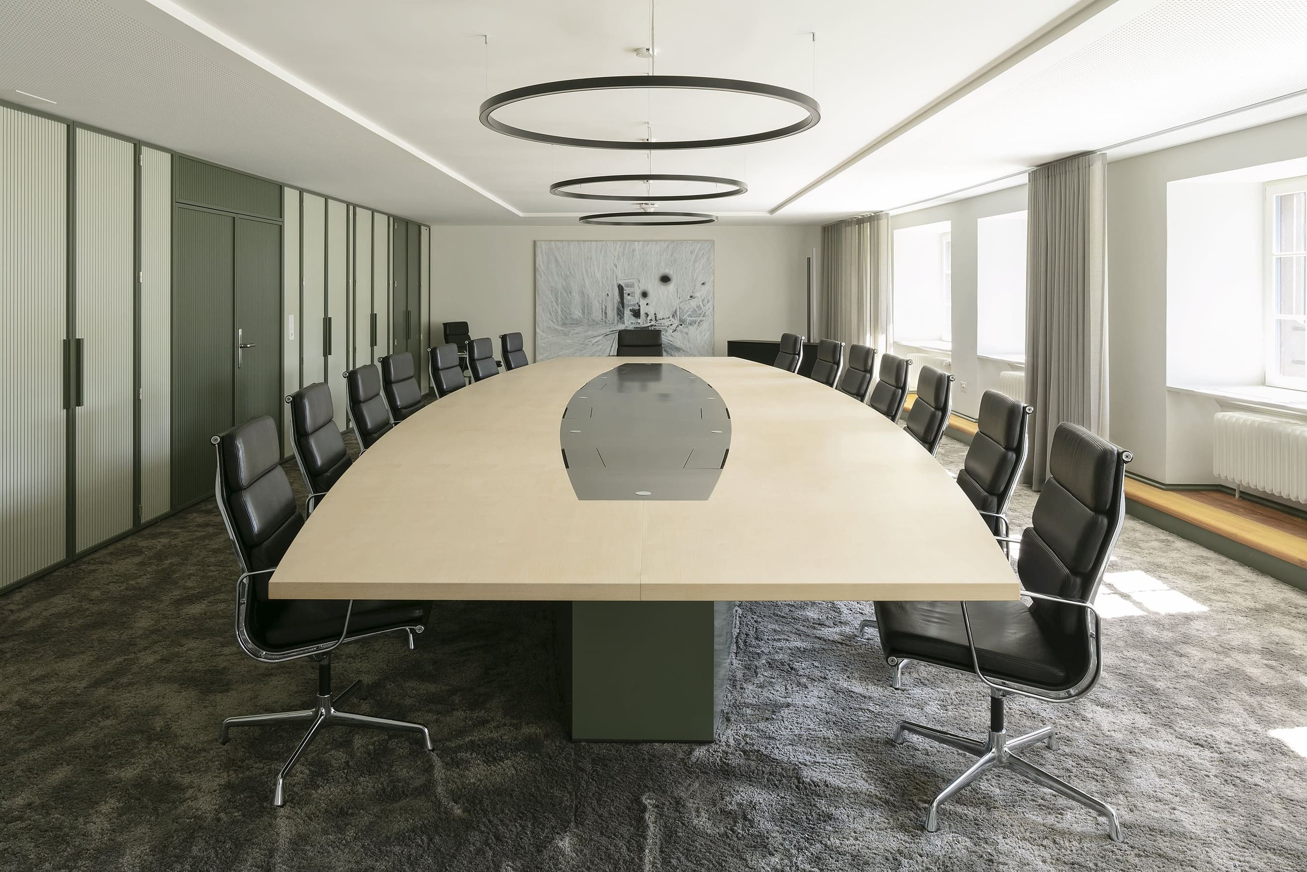 Buchen Sie das Sitzungszimmer Raum Nr. 204 für Ihre nächsten Meetings. Der Raum ist übersichtlich und fokussiert gestaltet und bietet Platz für maximal 12 Personen auf einer Fläche von 42m². Diese Umgebung ist ideal für konzentrierte Besprechungen und effiziente Arbeitstreffen.